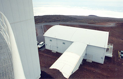 今月は、マウナケア山頂にある すばる望遠鏡の観測制御棟について見ていきましょう。2001年2月のトピックスにおいてもご紹介したように、マウナケア山中腹の標高約 2,800 メートルに位置する「ハレポハク中間宿泊施設」は、夜間に天体観測を行う天文学者が宿泊したり、日中に山頂で作業を行うスタッフが休憩を取るところです。ハレポハク中間施設から山頂までの 30 分間の道のりは、4輪駆動車でのみ登ることができます。