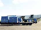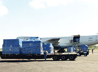 ハワイ観測所の山麓施設では、現在スーパーコンピュータの交換作業が進められています。成田空港を発った貨物便が2002年2月3日朝、ハワイ島ヒロ空港に到着しました。日本からジャンボジェット機の直行便がヒロ空港に着陸したのは、今回が初めてのことです。
