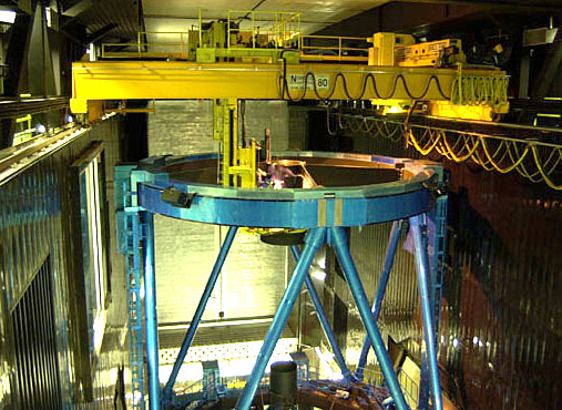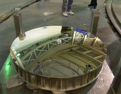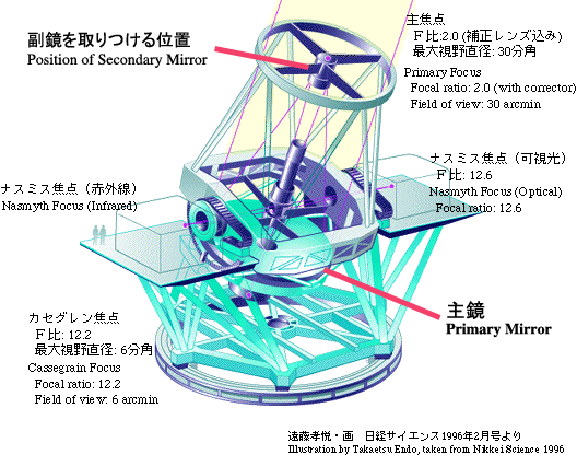 すばる望遠鏡では、口径8.2メートル、重さ23トンの主鏡で天体の光を反射させて副鏡に集め、最終的に観測装置へ導きます。 赤外線観測用の副鏡の口径は1.3メートル、重さは185キログラムです。主に IRCS、CIAO、OHS、COMICS の赤外線用観測装置 と組み合わせて使用します。この副鏡のほかにも、FOCAS や HDS などの可視光観測装置と共に用いる可視光用副鏡が2台あります。副鏡の代わりに、可視光の広視野カメラ Suprime-Cam を取りつけることによって、すばる望遠鏡では一度に広い視野を撮影することも可能です。