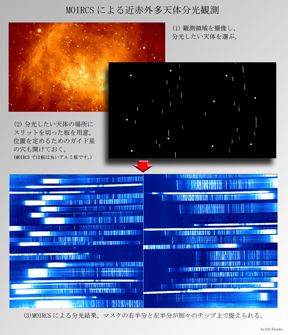 撮像観測で優れた能力を持つ MOIRCS は、口径が8-10m級の大望遠鏡では世界で初めて、近赤外波長域で一度に複数の天体の分光観測を行う多天体分光機能を備えています。分光観測とは、天体から届く光を波長毎に分解し、天体の物理情報を詳しく調べる手法です。IRCS や OHS をはじめとするこれまでの近赤外線の分光装置は、一度に一つの天体の光を分解できるだけでした。一度にたくさんの天体の光を分光できる MOIRCS では、観測の効率を劇的に上げることが可能になります。