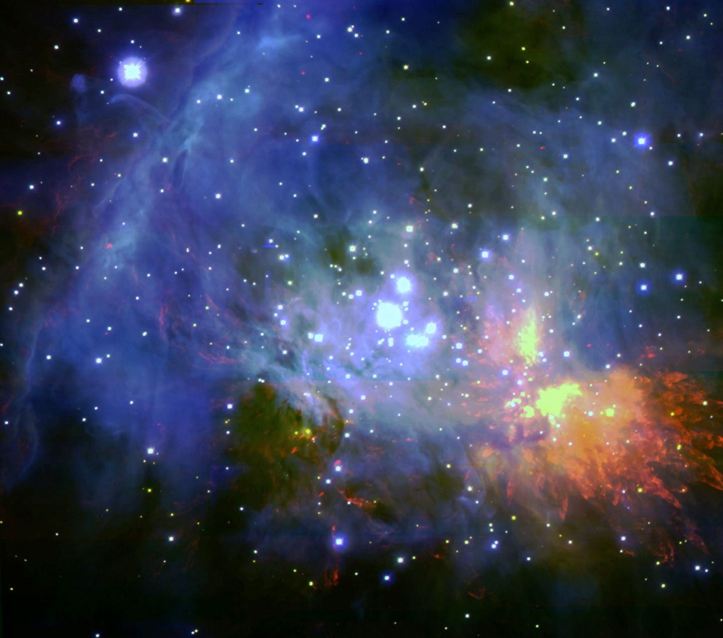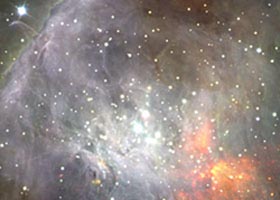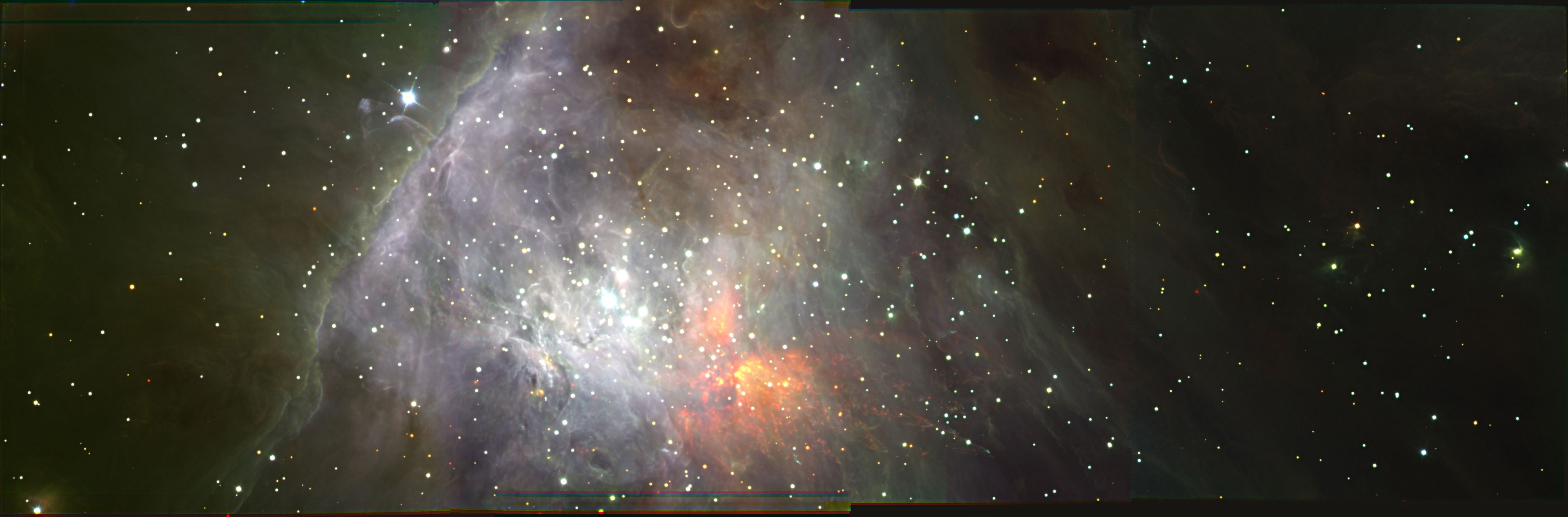 図2 は、2004年に行った最初のエンジニアリング試験観測の際に、2回の撮像によって取得したオリオン星雲 (メシエ42) です。この画像を視野の狭い近赤外撮像カメラ CISCO で得ようとすると、17回もの撮像が必要になります。MOIRCS が捉えたオリオン星雲の画像と、CISCO を使い 9回もの撮像により合成したオリオン星雲の画像 (すばる望遠鏡のファーストライト画像:1999年1月発表) を比較してみてください。MOIRCS の視野の広さが実感していただけるでしょう。