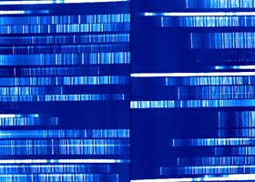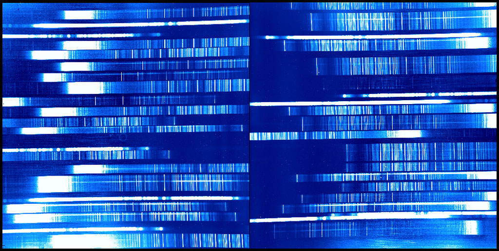 | 図4:MOIRCS多天体分光データ(全体) MOIRCS の一回の観測により得られた多天体分光観測のオリジナルデータ (H+Kバンド) 。データは画面中央で右と左とに分かれており、中央から左右の外へ向かう方向がそれぞれ波長の長い側。画像中には、31個の天体のスペクトルが写っており、口径が8m級望遠鏡で同時に得られた近赤外分光スペクトルとしては、これまでで最も数が多いものの一つ。バーコード状の一つ一つが、多天体マスク上にあけられたスリットによってできた近赤外線スペクトル。ただし、バーコード模様そのものは地球大気によるスペクトルで、天体の光を分解したスペクトルはバーコード模様の中に横に伸びた細い筋である。左右に伸びる細い白い線は位置参照用の星の穴によるもの。(多天体分光観測の概念図はこちら。) |