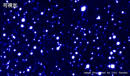 二つ目の画像 (図3) は、MOIRCS によって私たちの銀河系の中心方向を撮影したものです。銀河面に沿って広がる大量の星と、私たちにより近いところにある厚い暗黒星雲が複雑に混ざり合い、きわめて印象的な姿を見せています。近赤外線は可視光よりも暗黒星雲などに吸収されにくいため、銀河系の中心方向にある星々を近赤外線装置である MOIRCS ははっきりと捉える事ができるのです。同じ領域を赤外線と近可視光で撮影した画像と比較すると、可視光の画像には銀河中心の方向にある星々がまったく写っていないことがわかかります (比較の画像はこちら) 。