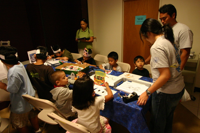 The activities offered in Subaru’s area included poster displays, sprectroscopy demonstrations, a scale model of the summit of Mauna Kea showing observatory locations, and many other interactive, youth-oriented stations. The team from Subaru enthusiastically shared information, stories, and insights about the observatory, its discoveries, and state-of-the art technologies, including details of the new HiCIAO and FMOS (Fibre Multi-Object Spectrograph) instruments. HiCIAO is a highly sensitive coronagraphic imager that blocks out the light from a star so faint objects near that star, such as planets, can be observed, while FMOS is our newest instrument and can obtain spectra from 400 objects simultaneously from a very wide field of view. The public enjoyed the opportunity to explore our solar system and nearby galaxy using the 3-D software program “Mitaka” developed by the Four Dimensional Digital Universe Project (4D2U) at the National Astronomical Observatory of Japan. “Flying through the rings of Saturn and seeing where a comet put holes in Jupiter in 1994 was so cool”, said a third grade student from Waiakea elementary. The younger crowd appreciated the arts and crafts offered in our Kid’s Corner, especially making and wearing their own “Subaru Boy” hat, which roughly depicts the shape of our observatory. Children who successfully completed all the interesting activities in the Kid’s Corner had their photo taken proudly showing a certificate of completion. Throughout the day our space was filled with visitors, and we estimate that over 500 people stopped by.