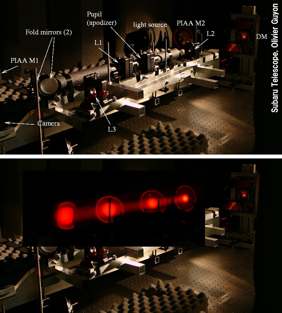 ハワイ観測所のオリビエ・ギュオン博士が、太陽系外惑星探査に威力を発揮するPIAA (Phase-Induced Amplitude Apodization) という新しい技術を開発しました。太陽以外の恒星の周りにある系外惑星の検出に使用されるのが、明るい中心星の光をさえぎるステラーコロナグラフと呼ばれる観測装置です。コロナグラフに PIAA 技術を応用することによって、望遠鏡で集めた天体の光を失わずに、明るさと解像度を保ちながらコントラストを高めることができ、その結果として地球のような惑星の検出が可能になると期待されています。PIAA の実験開発は、国立天文台と NASA-JPLが協力してすすめています。