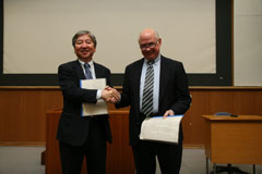 協定書への署名は、2008年8月に行われました。この度、国立天文台三鷹キャンパスにて開催中の「すばる利用者会議 (Subaru Users' Meeting)」にあわせ、日本時間 2009年1月15日に観山正見・国立天文台長とプリンストン大学研究担当学部長の A.J. Stewart Smith 教授が出席して調印式が執り行われました。この共同研究は、国立天文台およびプリンストン大学の代表者からなる協力協議会により管理・運営され、今後10年間継続される予定です。