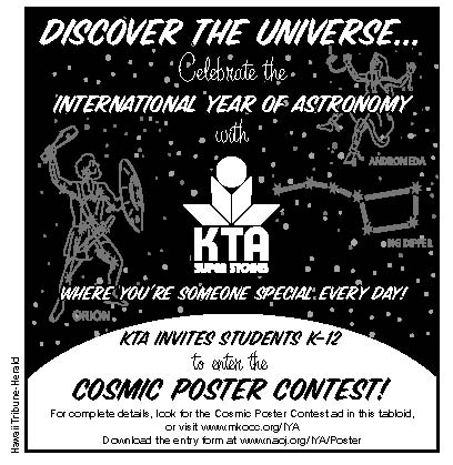 The deadline to enter is March 31. Entries will be divided between one of three districts (East, North, or West) on the Big Island, according to the location of the school from which the entrant attends. Entries are then placed in one of three age groups: (1) Elementary, Grades K-5; (2) intermediate, Grades 6-8; (3) High School, Grades 9-12. Judging will be done by astronomy and KTA judges for each category at each district. Winners of the three districts at each category will be nominated to the Island-wide contest which is judged by Jon Lomberg, the space artist who lives on the Big Island. The awards ceremony will be held on AstroDay, May 2, 2009 at Prince Kuhio Plaza in Hilo, and the winners’ posters will be shown there. All winning posters will be on display at KTA Super Stores, `Imiloa Astronomy Center of Hawai`i, and Onizuka Space Center, as well as on Cosmic Poster Contest Official Site.