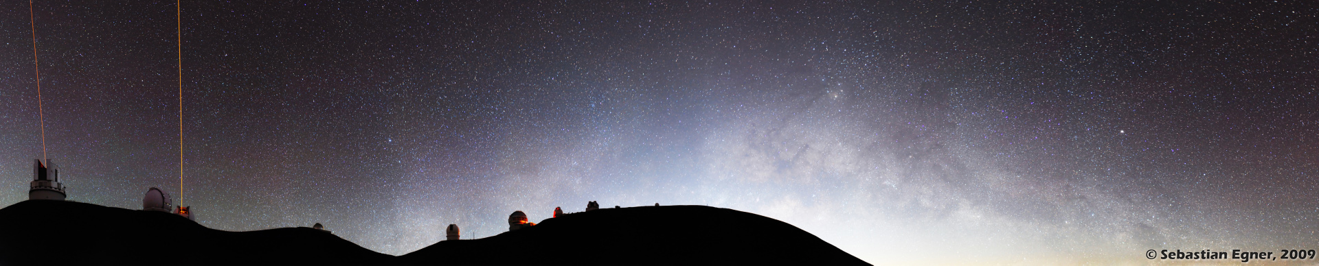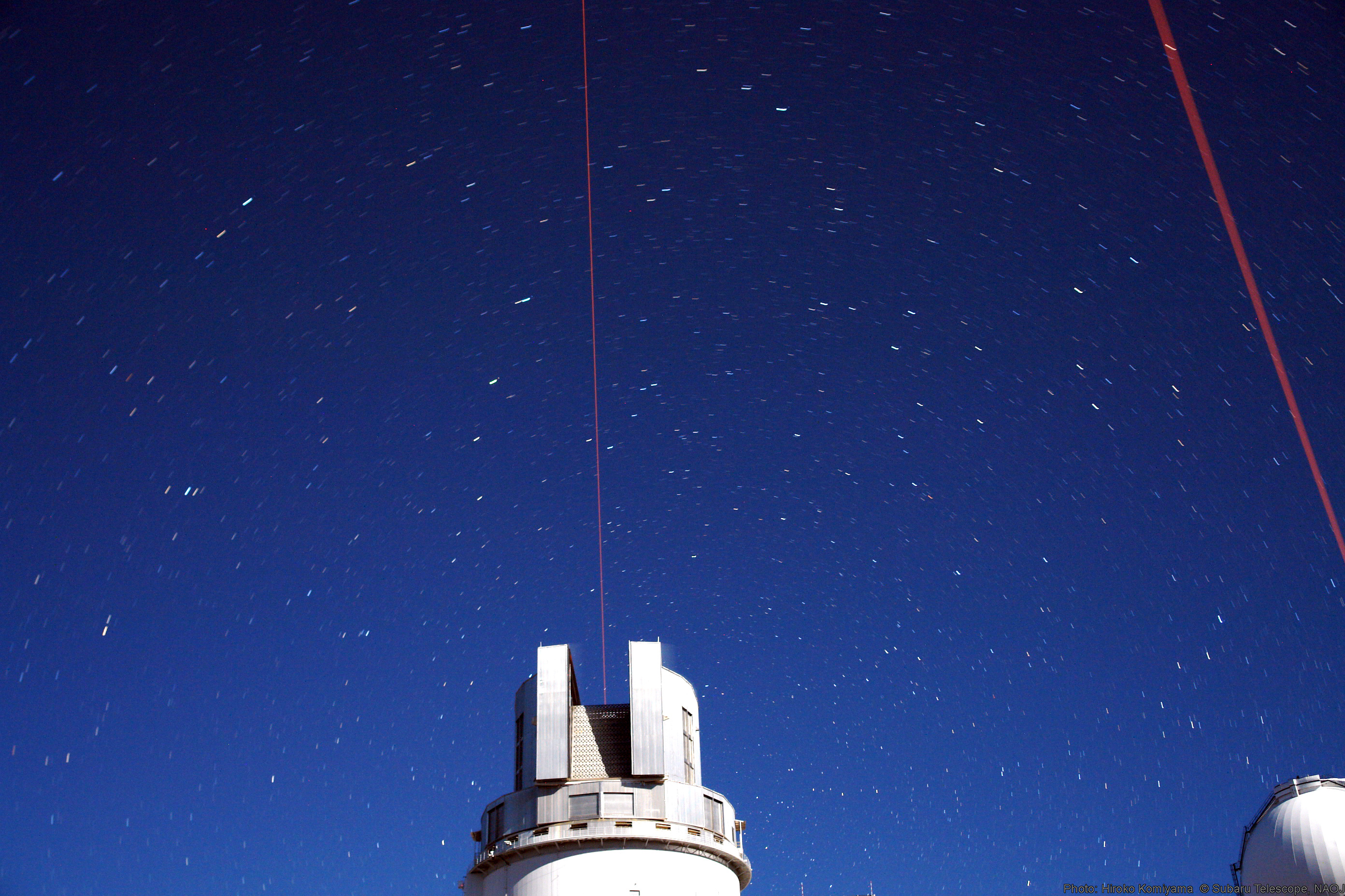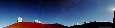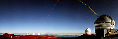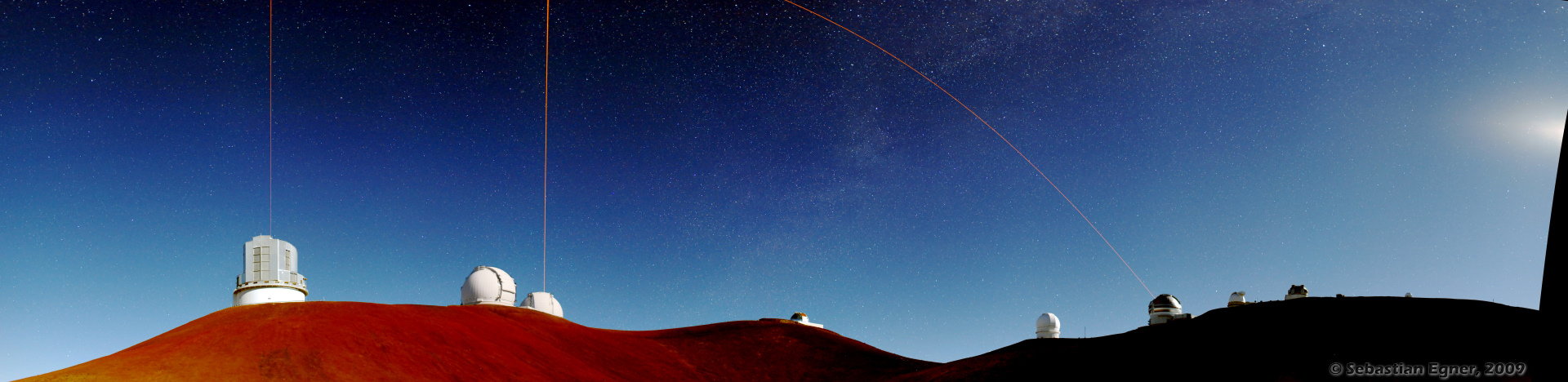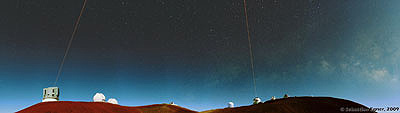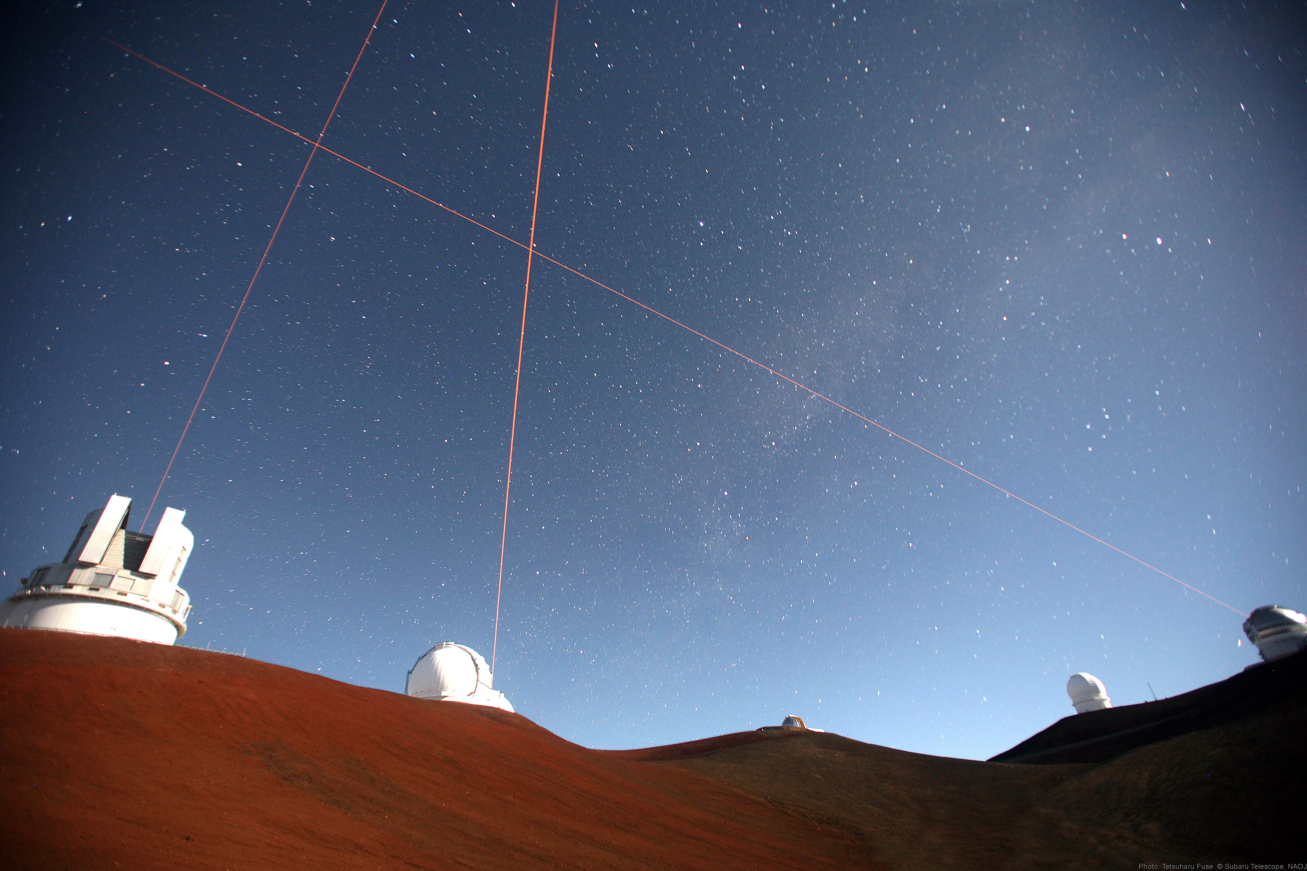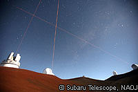 マウナケア山頂にあるすばる望遠鏡、ケック望遠鏡、ジェミニ北望遠鏡の 3 台の大型望遠鏡には、それぞれ波面補償光学装置とレーザーガイド星生成システムが備わっています。すばる望遠鏡では、 2006 年暮れにはじめてレーザービームの照射実験に成功しました (詳しいことは、こちら)。その後は精度を高めるため、さらなる試験観測を続けています。