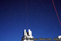 ただし、波面補償光学装置を用いる際は、観測する天体の近傍に、ゆらぎを測定するための明るい星 (ガイド星) がなければなりません。都合よくガイド星がない場合に、威力を発揮する仕組みがレーザーガイド星生成システムです。レーザービームを観測天体近くの上空約 90 kmの大気中に照射して人工の星を作り、大気のゆらぎを測定するガイド星とします (詳しいことは、こちら)。
