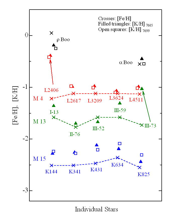 図1: 観測した個々の星の[K/H] (カリウム組成:λ7665線とλ7699線のそれぞれから導いた値)と[Fe/H](鉄組成)の比較。組成はいずれも太陽に相対的な値である。 (拡大) |