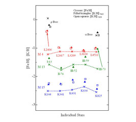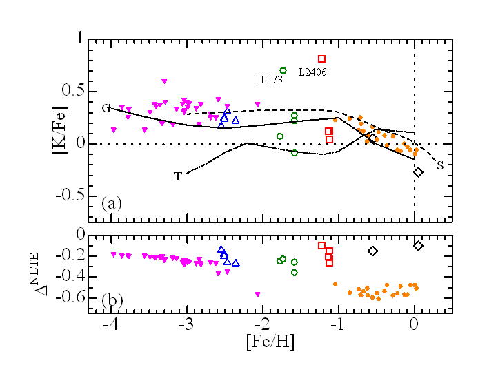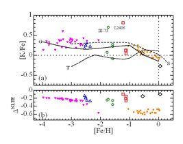 図2: 上図(a)は[K/Fe]比(カリウム対鉄の相対組成比)の[Fe/H](鉄組成で金属量の目安)に対するふるまい、下図(b)はΔ(NLTE)(カリウム組成を求める際に適用したnon-LTE補正)の[Fe/H]に対するプロット。今回観測した星は大きな中抜き記号で示してある(△:M15, ○:M13, □:M4, ◇:標準星)。比較のために超金属欠乏星(▼)とディスクの星(●)の[K/Fe]比も塗りつぶした小さな記号で表示した。三本の曲線は理論的に計算された[K/Fe]-[Fe/H]関係である。 (拡大) |