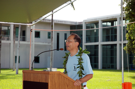 The opening ceremony next to the Subaru Base Facility began with a traditional Hawai`ian chant, followed by Dr. Usuda's expression of appreciation to all of those who had worked so diligently to create the block party. Congratulations from Hawai`i Governor Lingle's office as well as Senator Inouye's envoy marked the significance of the occasion. Dr. Rose Tseng, Chancellor of the University of Hawai`i at Hilo, noted that it was "exciting to be part of a global event" and remarked that the "important work being done here is touching people all over the world". Dr. Masahiko Hayashi, Director of the Subaru Telescope, gave his "heartfelt thanks to the community for their support" and pointed out the issues facing modern astronomy—defining dark energy and discovering habitable extrasolar planets, “other worlds beyond our own.” County of Hawai`i Mayor Billy Kenoi concluded the initial festivities by thanking all of the observatories on Mauna Kea that are "at the center of the astronomy world" for extending our knowledge of the universe and being willing "to give to our most precious resources--our children."