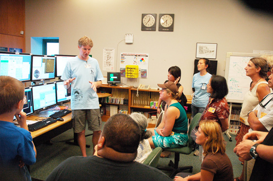 While solar observations, games, and demonstrations outside of the facilities were popular, special tours of some of the base facilities captured the interest of many participants. Subaru provided the most extensive tour of its base facility, with staff conducting 30-minute tours every 20 minutes. Filled to capacity and sometimes overflowing with adults and keiki, the tour groups were escorted from the main lobby to the remote observation room and the simulation lab. Demonstrations of how remote observations occur as well as discussions of the research and testing carried out in the simulation lab enlightened visitors about the significant work conducted at the facility.