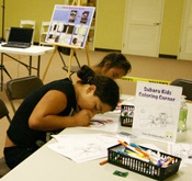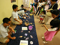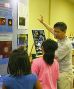 Subaru filled its spacious area with a round of engaging offerings. Computer screens beckoned visitors to "test drive" the telescope by remote observation. Kids enjoyed a coloring corner, complete with crayons and blank pictures of telescopes and celestial objects, ready to come to life with coloring. Nearby were demonstrations of how adaptive optics or a coronograph work as well as panel displays of the telescope and descriptions of summit tours. A number of other activities were particularly popular, each drawing over 300 people. At the kid's corner, hundreds of children used fishing poles strung with lines fitted with large paper-clip "hooks" to reel in objects in our solar system. During spectroscopy demonstrations, about 350 people peered at different types of light bulbs through a spectrum card. And, at the greeting table, several hundred visitors picked up Mauna Kea Observatories Trading Cards.
