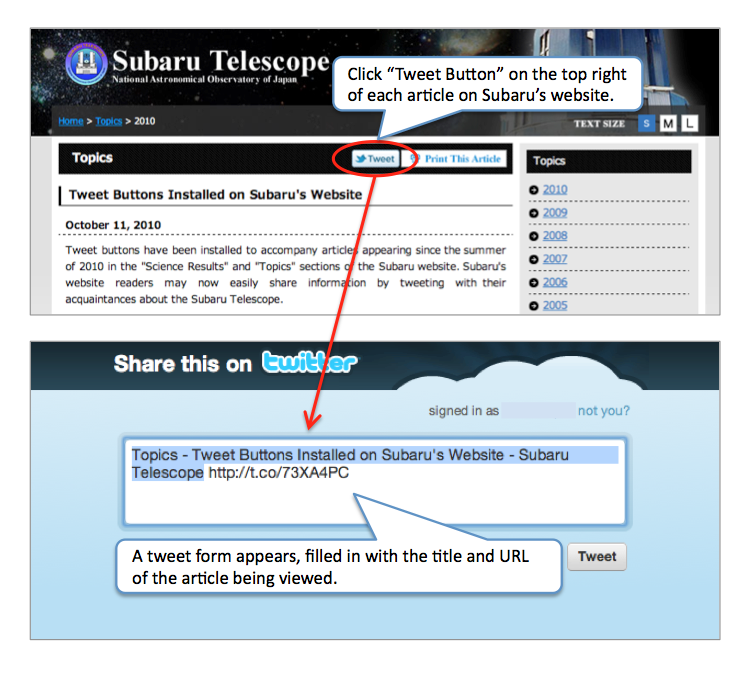 Tweet buttons have been installed to accompany articles appearing since the summer of 2010 in the "Science Results" and "Topics" sections of the Subaru website. Subaru's website readers may now easily share information by tweeting with their acquaintances about the Subaru Telescope.