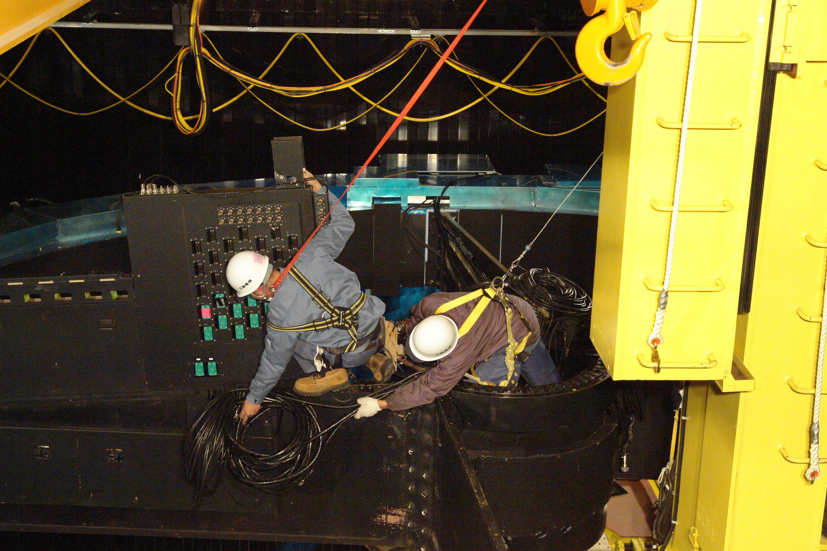 望遠鏡のてっぺんの内部の筒 (内環) を削ったのは、やがて導入される新世代の観測装置が大型であるため、それを入れられるようにするためです。おまけに重さも増えるので、望遠鏡のあちこちにそれと釣り合いをとるための重りも付けました。たくさんのケーブルを外したり、戻したり、やっぱり息切れがして大変な作業でしたよ。