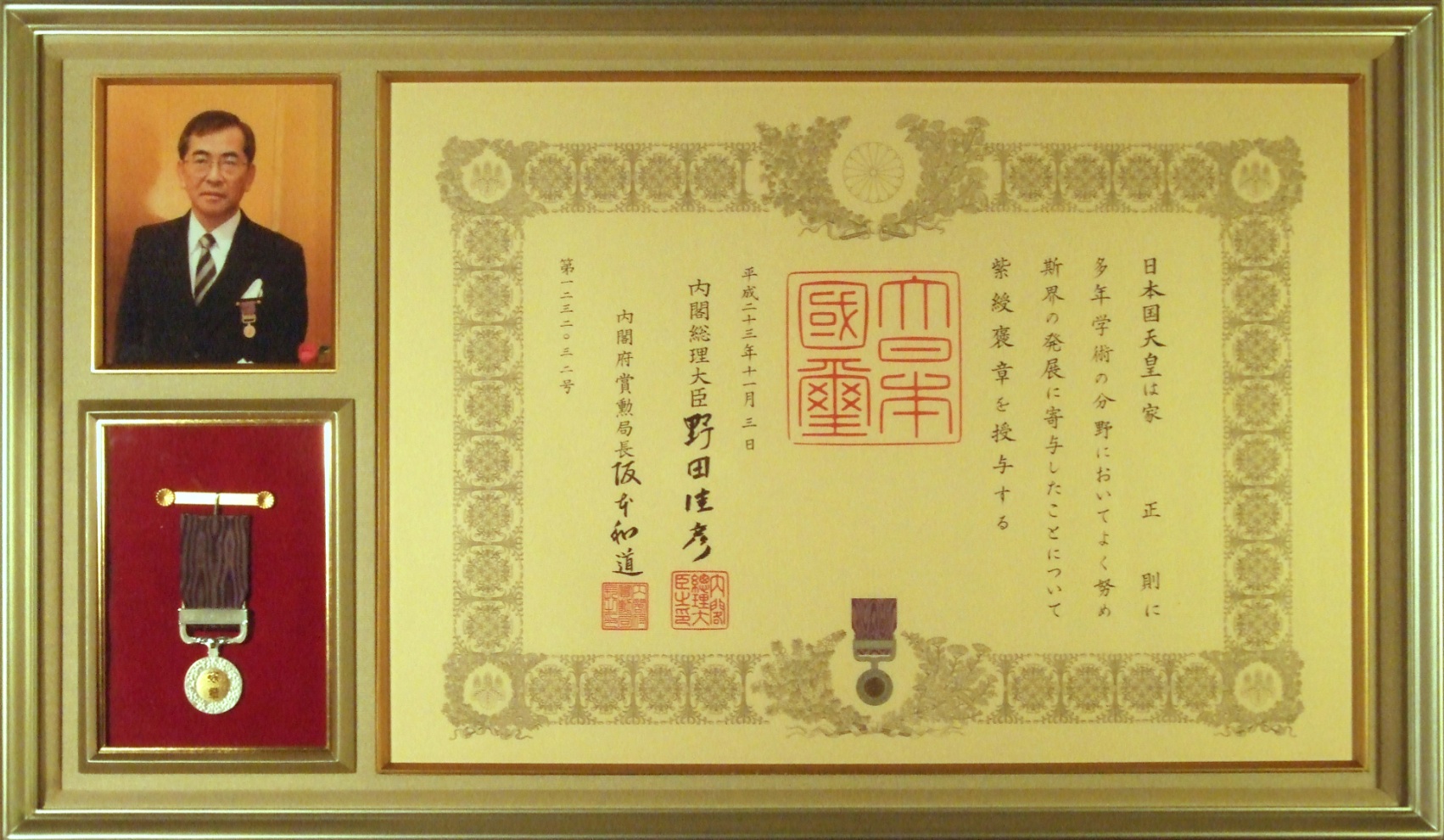 写真: 家教授が受章された紫綬褒章と章記。章記には「日本国天皇は 家正則 に多年学術の分野においてよく努め斯界の発展に寄与したことについて紫綬褒章を授与する」と記されています。 |