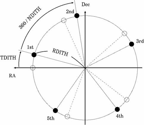 The figure above shows a dithering pattern on the sky for NDITH=5. Exposures will be performed at each position of filled circles.