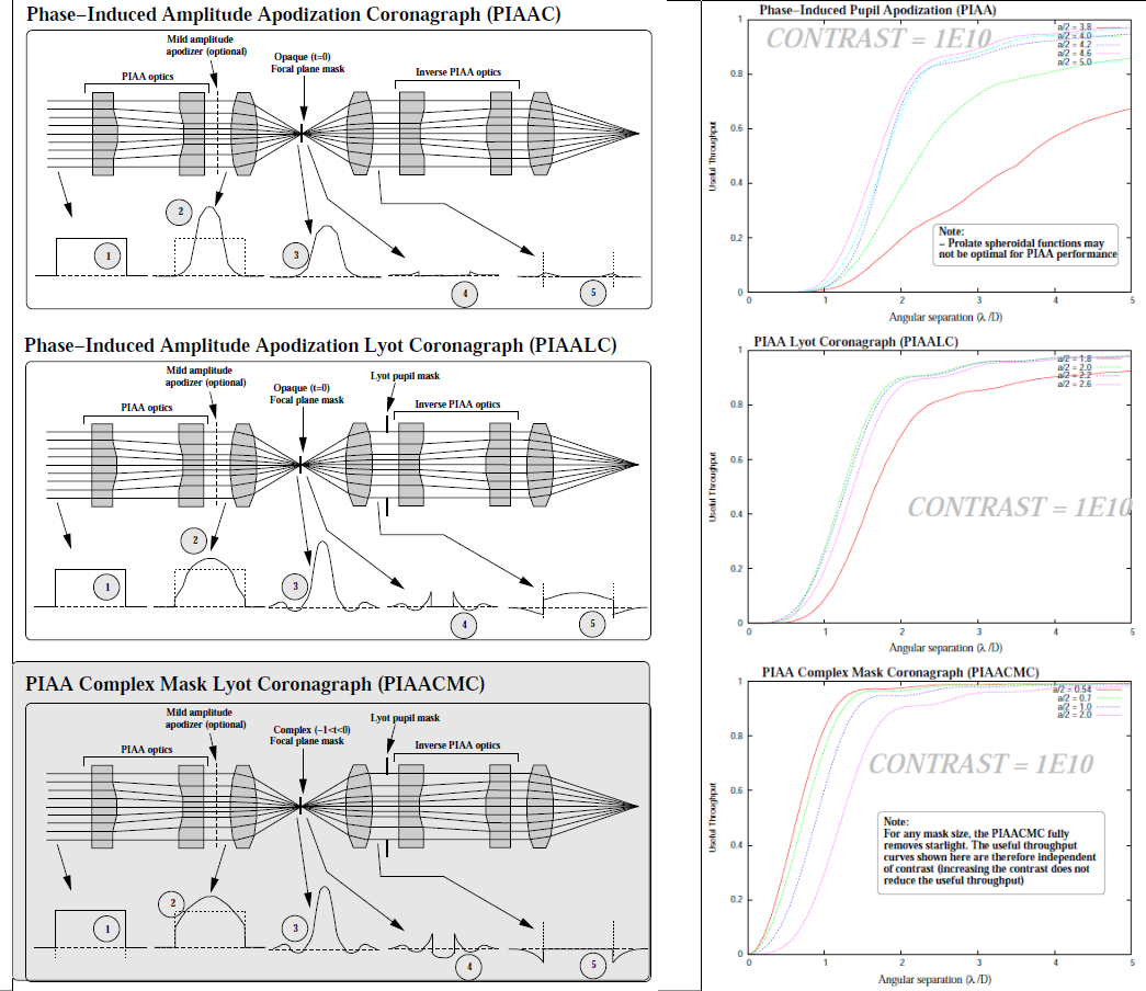 PIAA-based coronagraph architectures (left) and corresponding performance (right). Top row: conventional PIAA coronagraph. Middle row: PIAA / Lyot coronagraph. Bottom row: PIAACMC.