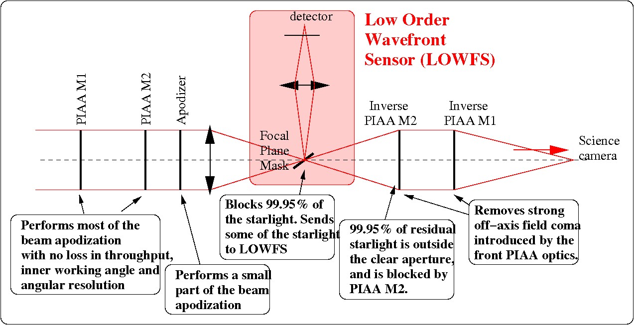 1.6 Low Order Wavefront Sensor (LOWFS)The LOWFS uses light reflected by the outside part (from 0.6 l/D to 1 l/D radius) of the focal plane occulter. This light, which would otherwise be lost, is used to measure low order aberrations (Tip/Tilt, Focus, Astigmatism) in the coronagraph by acquiring on the same small format detector inside and outside focus images of the focal plane mask. Thanks to the large number of available photons, and to the fact that only light in the part of the PSF which is most sensitive to low order aberrations is used, the LOWFS provides accurate measurement of pointing, focus and astigmatism within a short exposure time: it takes 1/70 sec to measure pointing at the required 0.5% l/D accuracy, and 1.2 sec to measure focus to the required 1e-3 radian accuracy on a m=10 star (the faintest end of EXCEDE's target list). This measurement serves two purposes, both essential to achieving the full performance of the EXCEDE PIAA/Lyot coronagraph: