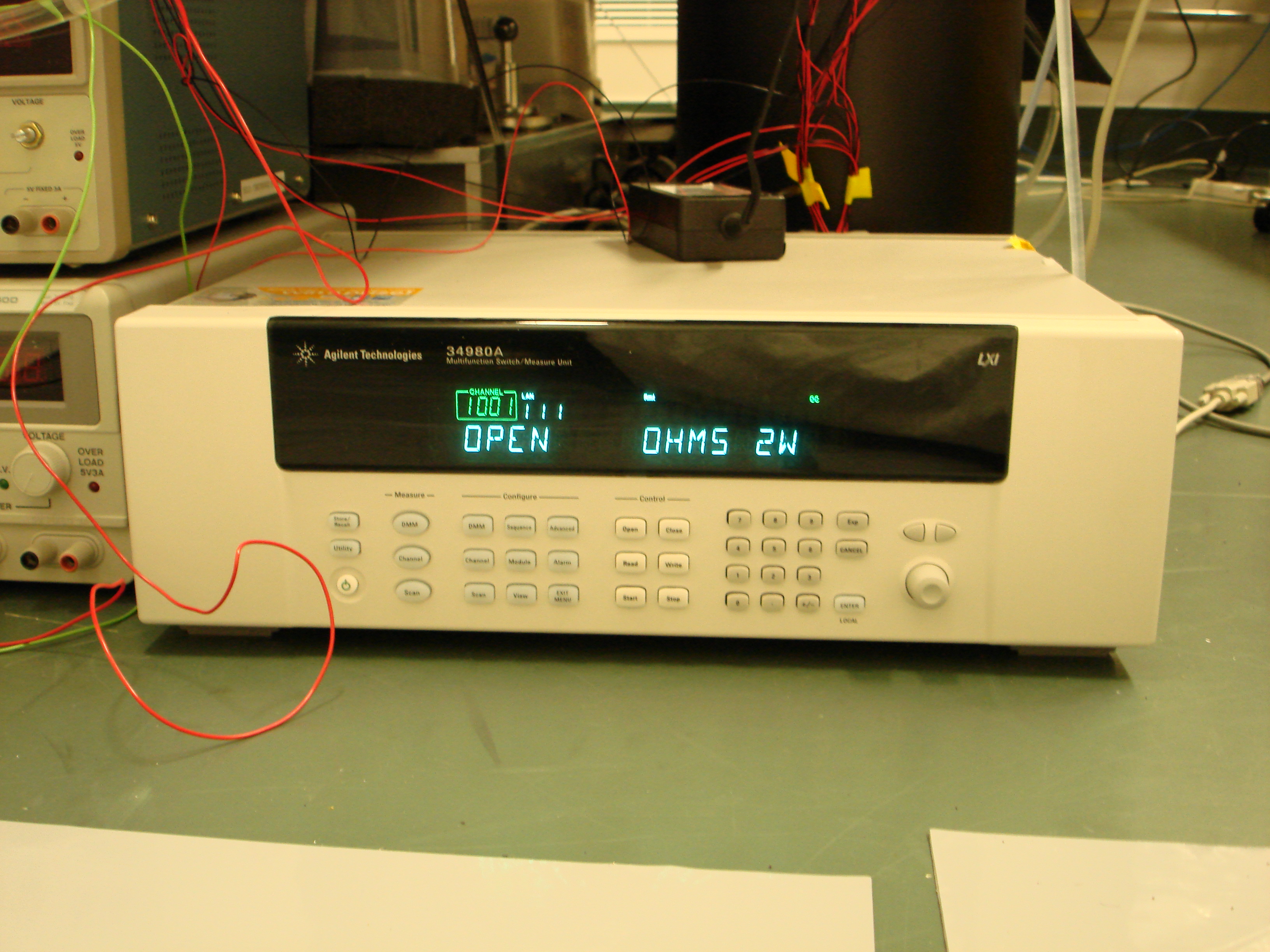 Data acquisition unit (Agilent 34980A) used for temperature measurement. To obtain maximum sensitivity, the unit is used in 2 wire (2W) resistance measurement rather than temperature measurement. Resistance is then converted into temperature by software. An ethernet port is used to communicate with the unit. WARNING: temperatures cannot be measured below 20.9 C, due to the match between RTD resistance range and data acquisition unit range.