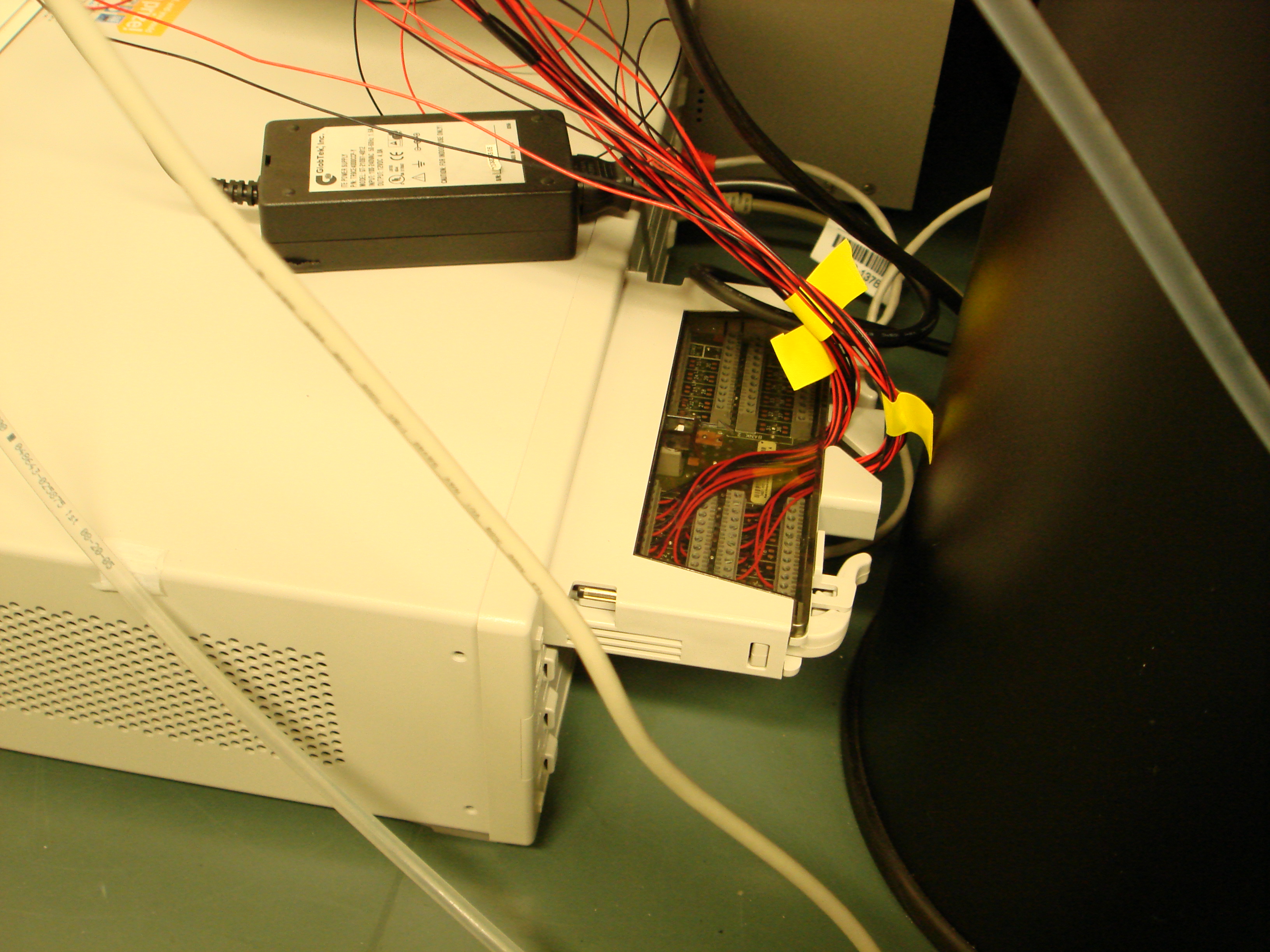 Back of the data acquisition unit showing the connections to the thermistors. We use one module (module 34921A with terminal block connector 34921T), which can connect to 40 thermistors. A maximum of 8 modules can be used for this unit.
