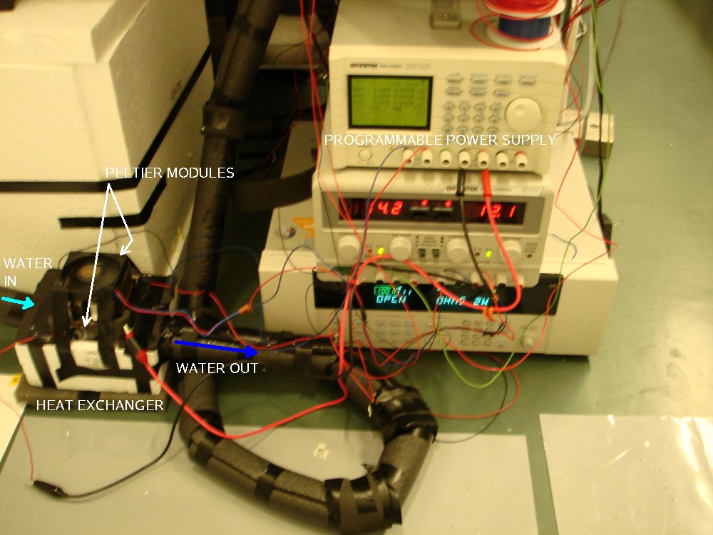 Our temperature regulation mostly relies on a water circuit running through the bench, that includes a heat exchanger with five peltier modules, outside the enclosure. The modules are supplied in current by a computer controlled source, and we were thus able to implement a PID loop, using the data from temperature sensors located at the exit of the heat exchanger. Max power sent to Peltier is 57 W (cooling power ~ 17 W, assuming 30% efficiency).