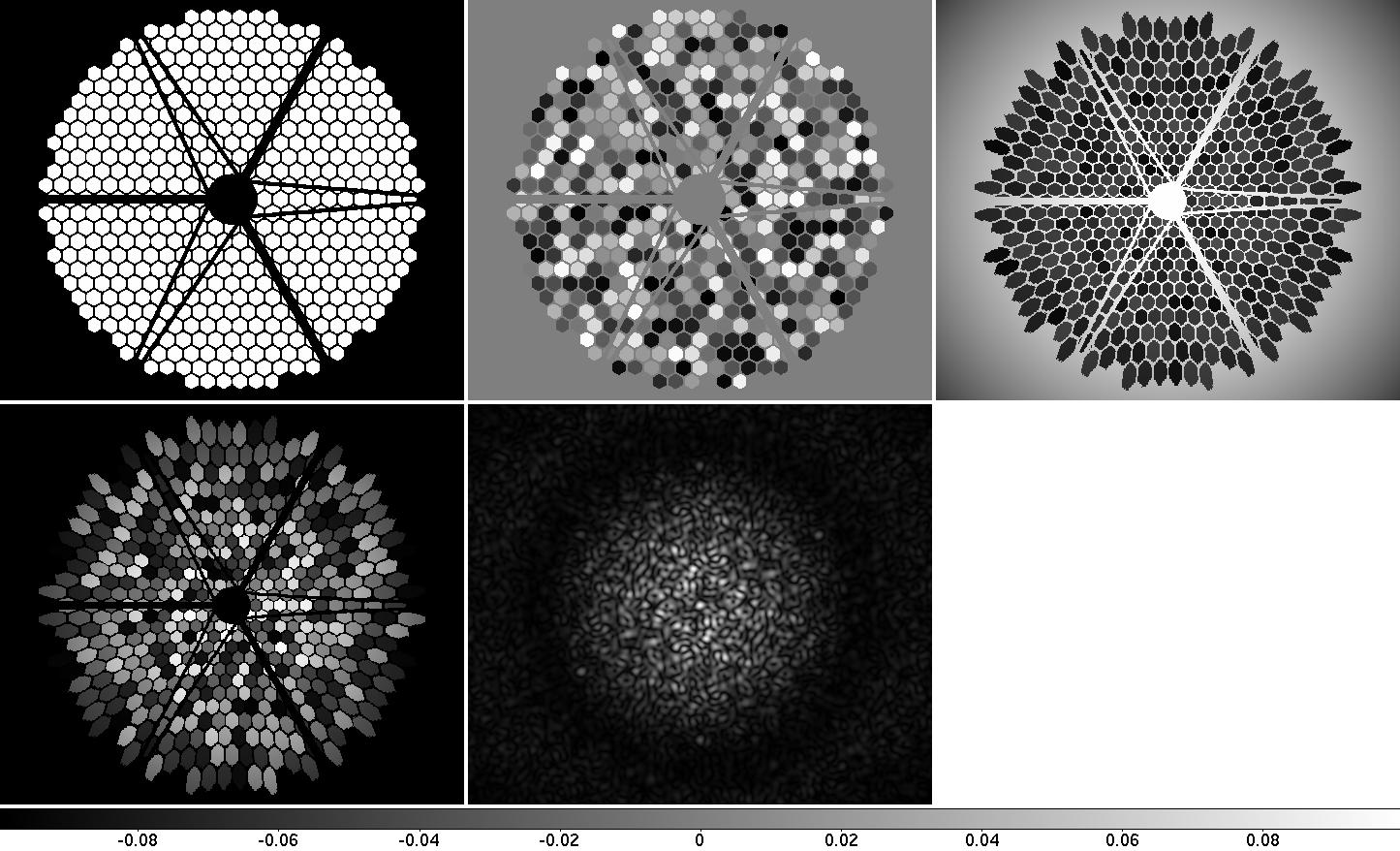 Fig 2.1: Effect of cophasing error on coronagraph performance. The entrance pupil amplitude (top left) and phase (top center) chosen in this example correspond to the TMT pupil with segment phases following the uniform probability distribution from -0.1 rad to +0.1 rad. The coronagraph output pupil (top right) shows that most of the light is diffracted outside the pupil, but a small amount of light remains in the pupil due to cophasing errors. After applying the Lyot mask (bottom left), the contribution of each segment to the coronagraphic leak is seen to be propotional to the square of the segment phase error. The final on-axis PSF (bottom center) shows that the speckle halo follows the envelop defined by the diffraction pattern of a single segment.