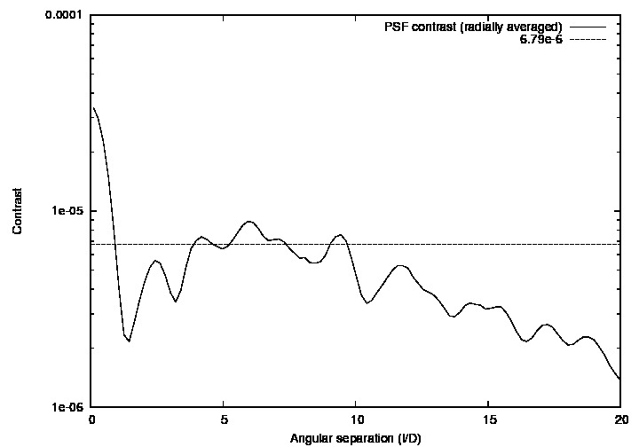 If the TMT pupil were unobstructed and fully paved, it would consist of 491 segments. The expected contrast level in this example, according to equation (1), is therefore 0.05772/491 = 6.78e-6. As shown in figure 2.2, this prediction is in good agreement with the numerically computed PSF radially averaged contrast.