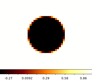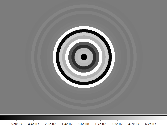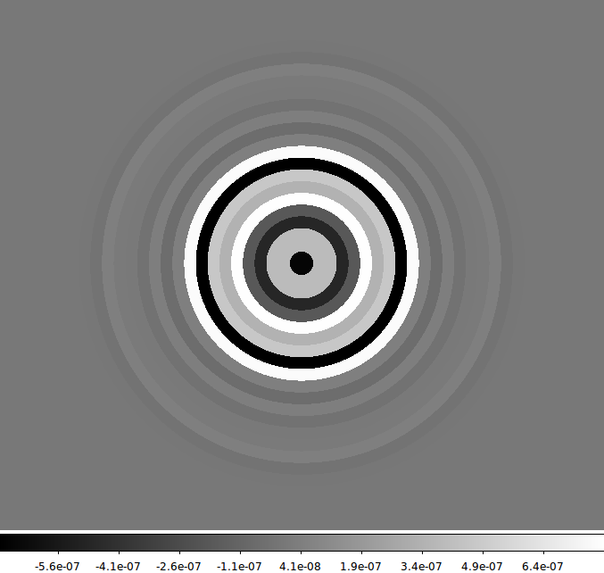 For polychromatic operation, the focal plane mask consists of a transmissive SiO2 substrate with concentric rings, each with a different thickness. There are 19 rings in this design, regularly spaced, with the outer edge of the outer ring at 2 l/D radius at the center wavelength (0.5um). In this simulation, it is assumed that there is no WF control and that all optics are perfect.