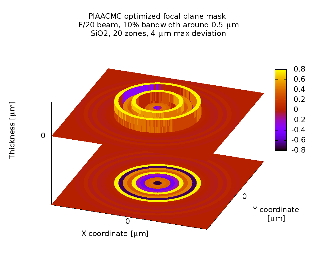In the PIAACMC architecture adopted, the focal plane mask is a key element which must create a destructive interference within the open areas of the geometrical pupil in the Lyot plane (Fig. 4, left). This requires careful control of both phase and amplitude as a function of wavelength. We will achieve this with a multi-zone reflective focal plane, which is made of silicon, following successful proven manufacturing capabilities at JPL's micro devices laboratory (MDL)