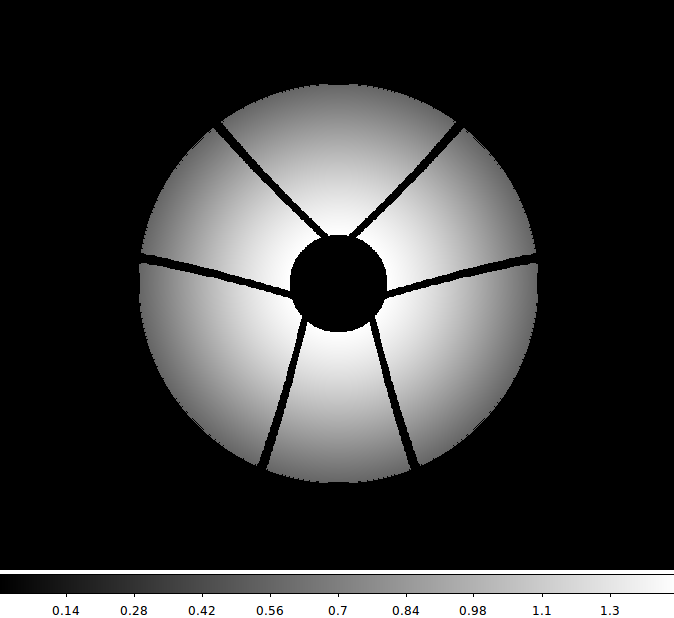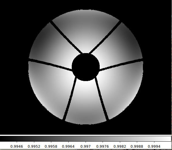 The post apodizer is a small correction from the circular symmetric apodization profile coming out of the PIAA optics (designed as a radial function for convenience) and the generalized prolate spheroidal apodization function for the AFTA pupil. Note the scale: the darkest parts of this mask have 99% intensity transmission.