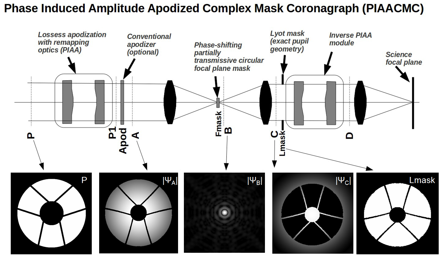 Phase Induced Amplitude Apodization (PIAACMC) principle, shown here for the AFTA pupil in monochromatic light. The pupil (P) is first apodized into a generalized prolate function (A) using lossless PIAA optics and an optional conventional apodizer. A partially transmissive phase-shifting focal plane mask is then used (B) to produce in the output pupil (C) a destructive interference. A Lyot mask then rejects all starlight while offering full throughput for off-axis sources. The inverse PIAA optics recover a sharp off-axis image over a reasonably wide field of view.