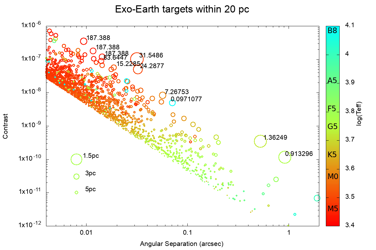 Show content only (no menu, header)Input star catalog1. Motivation and GoalsTo be habitable, a planet must receive from its host star a flux that is approximately equivalent to the flux received by Earth. When observed in reflected light, the apparent brightness of potentially habitable planets is therefore mostly a function of its distance (to the observer) and mostly independent of the host star brightness. Direct imaging of potentially habitable planet is therefore only possible around nearby stars (typically within 20pc for a ground-based ELT or a medium-sized space telescope). Direct detection of exoplanets is also constrained by contrast detection limits and inner working angle. While contrast limits tend to favor late-type main sequence stars, the inner working angle limit favors detection of habitable planets around early-type main sequence stars for which the habitable zone is further out from the star.Input star catalogs for direct imaging of potentially habitable exoplanets have been previously created for space missions concepts aimed at detection and characterization of Earth-like planets around F-G-K type main sequence stars. The Hipparcos catalog is usually adopted for these mission concepts, as it offers good completeness for F-G-K type stars within the approximately 20pc radius within which space-based telescopes can have the sensitivity to detect and characterize habitable planets. The superior angular resolution offered by ground-based extremely large telescopes (ELTs) brings potentially habitable planets around nearby M-type stars and white dwarfs within reach. For these types of targets, the Hipparcos catalog is incomplete, and other catalogs should be included as well. 2. Input catalogsIn order to cover a wide range of spectral types, several catalogs are used to construct the input star catalog for this study: