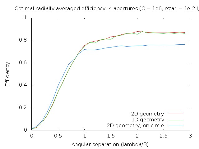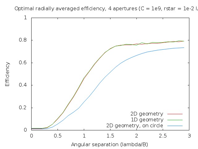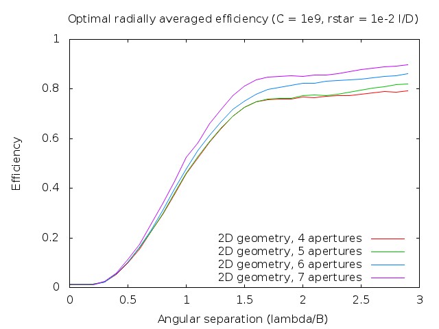 - Case 4: Search of planets with a visible interferometer at small angular separation. The contrast is 1e9, and the stellar radius is 1e-3 λ/D. The performance metric is the quadratically averaged SNR factor on a 0.7 λ/D radius circle.