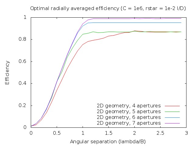 - A 7-aperture geometry consisting of a regular hexagon and a central aperture. For 4 out of its 7 outputs, the starlight rejection is better than 1e-8 for a 0.01 λ/B radius star. [png]