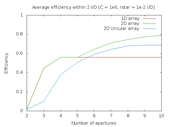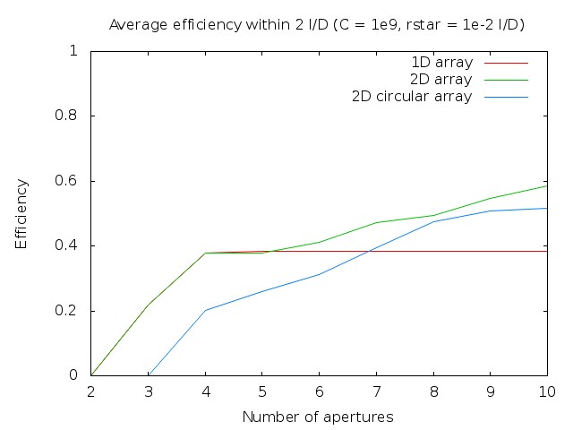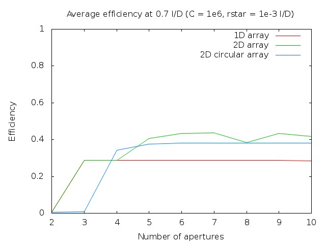 Efficiency as a function of number of apertures for case 1 (1e6 contrast, stellar radius = 1e-2 λ/D, averaged efficiency within a 2 λ/D distance from the star)
