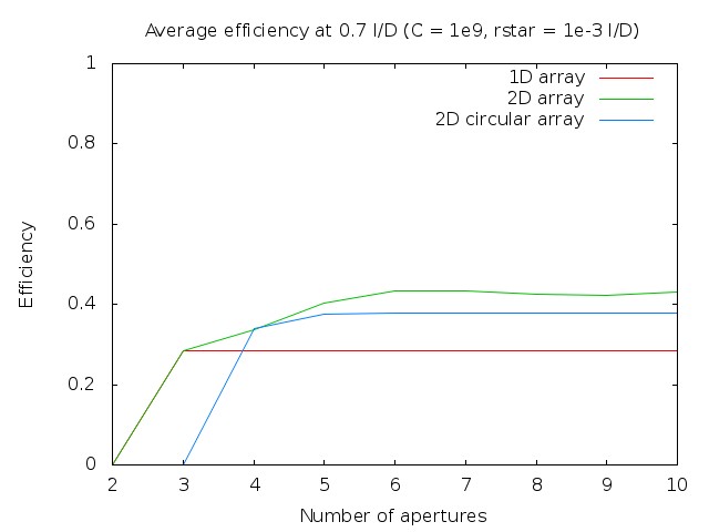 Efficiency as a function of number of apertures for case 4 (1e9 contrast, stellar radius = 1e-3 λ/D, averaged efficiency at 0.7 λ/D distance from the star)