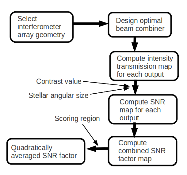 Figure 3.1 shows the main algorithm steps to evaluate the performance of an nulling interferometer geometry. First, the optimal beam combiner is designed following the technique descriped in this study . A transmission map Ik(α,β) of the interferometer is then constructed for each ouput k of the beam combiner. With knowledge of the stellar angular size, the stellar intensity output is computed for each output by integration of the transmission map Ik(α,β) over the stellar disk α2+β2 < rs2. For each output of the interferometer, a map of the SNR is then computed at fixed star-to-planet contrast value. The SNR maps (one map per interferometer output) are then combined into a single SNR map, which can then be quadratically averaged within the scoring region to produce the performance metric.