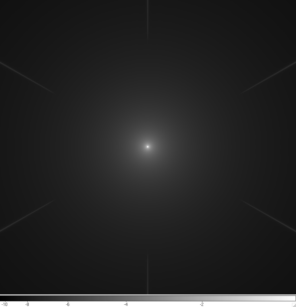 Fig 1-3: Central part of the PSF (log scale, 29 arcsec x 29 arcsec). The PSF is shown here with no coronagraph pickoff mirror.