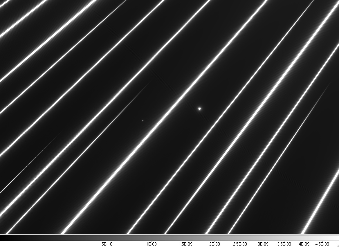 - Provide an adequately bright signal for the host star light. The host star is much brighter than the background stars used for astrometry. By distributing a few percent of the host star's light over a large number of pixels, the spikes provide a feature that can be imaged without saturation on the same detector as the background stars. A similar magnitude compensation scheme using a grating in front of the telescope has previously been used over small angles for ground-based astrometry of binary stars (Strand 1946), and more recently with a grating in a relay pupil for coronagraphic imaging and astrometry of faint companions with adaptive optics (Sivaramakrishnan & Oppenheimer 2006, Zimmerman et al, 2010). A related technique is also being used at the NASA Ames coronagraph testbed, where the location of the star and its brightness are measured by comparison with diffraction spikes generated by the periodic print-through structure on the deformable mirror.
