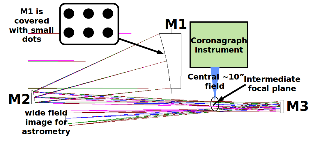 Fig 1-1: Example of a telescope architecture for simultaneous coronagraphic imaging and astrometry. The design shown in this figure is for a 1.4-m telescope, and offers less than 10-nm wavefront error in a 0.4 deg diameter field. The telescope primary mirror is covered with small dots.
