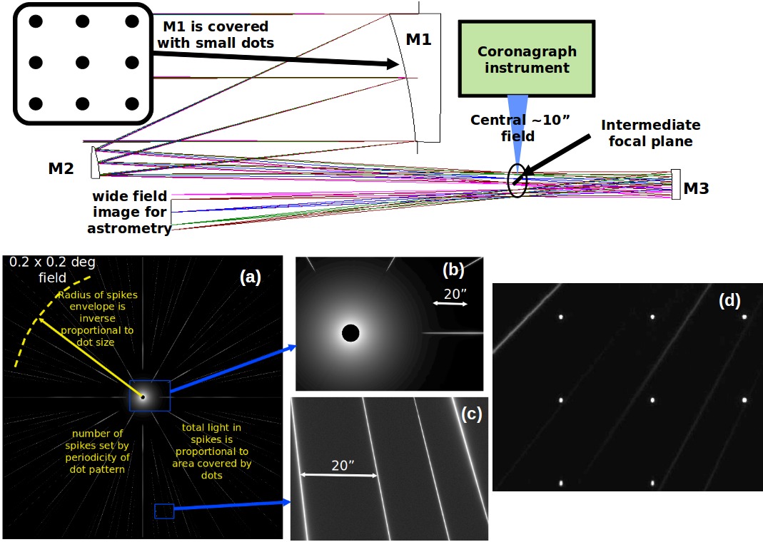 The regular grid of small non-reflective lithographed dots covers a few percent of the surface and is deposited on the front of the primary mirror. The image at the detector is the convolution of the field distribution with the Point Spread Function (PSF) obtained by Fourier transform of the pupil function. Since the Fourier transform of a regular grid of tightly spaced dots is a regular grid of widely spaced points, the monochromatic system PSF is an Airy pattern surrounded by a widely spaced grid of fainter Airy patterns. In polychromatic light, the secondary Airy patterns are radially dispersed, producing long diffraction spikes. This PSF appears at the focal plane for each field object displaced so it is centered where its star is imaged, respectively, modulated in brightness by the source magnitude. The spikes from the background objects are therefore very dim, while the spikes from the host star are much brighter. Light in the central part of the field is directed to the coronagraph, therefore suppressing its bright central Airy pattern while passing its polychromatic diffraction pattern (aka spikes) to the focal plane array used for astrometry.