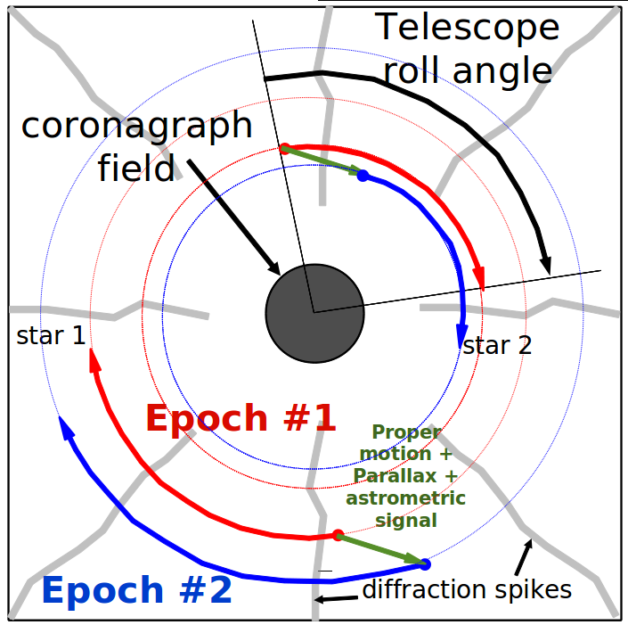 Images of the spikes and the background stars are acquired simultaneously by the focal plane array, while the telescope is slowly rolling. This allows calibration and averaging of astrometric errors down to sub-micro-arcsecond precision.