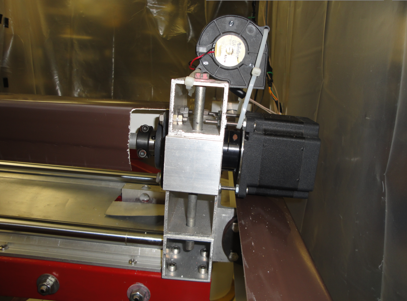 Y axis stepper motor driving the Y axis ball screw (not visible - behind the brown plastic cover).