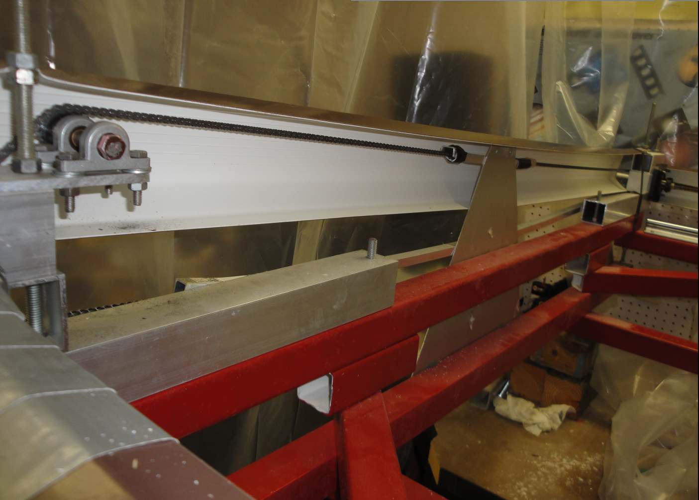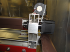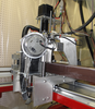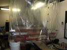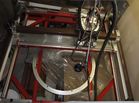 Wide view of the ginding/polishing machine. The plastic film around the machine, and the metal hose under, prevent dust buildup during plaster mold grinding, and keep dust away for polishing.