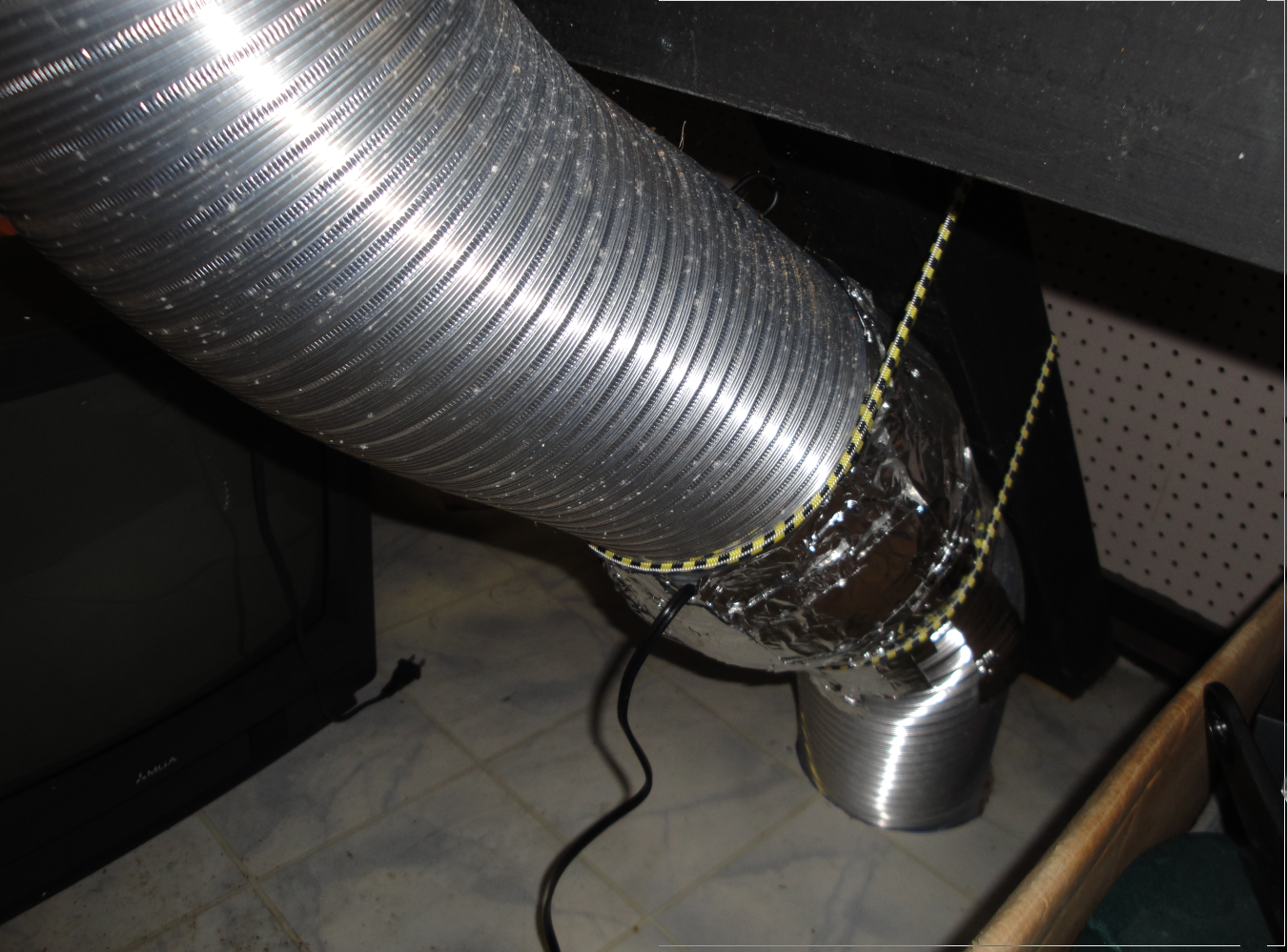 Dust evacuation duct. There is a 120VAC fan inside the duct to suck air from the top of the machine to the bottom and send it outside the building through a hole in the floor.