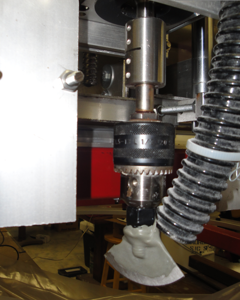 Grinding head. The black plastic pipe is for dust control, and is connected to a modified vacuum cleaner outside the building.