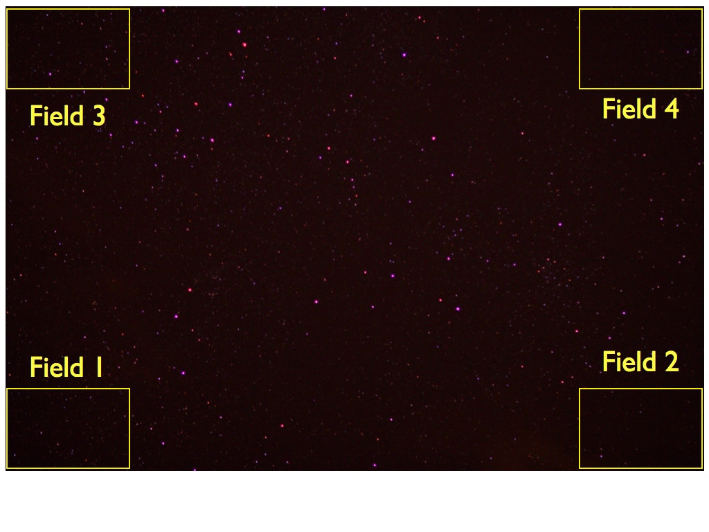 Four star fields, at the corner of the full field image, are magnified in the next image to show how PSF sharpness changes across the field.