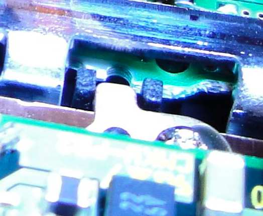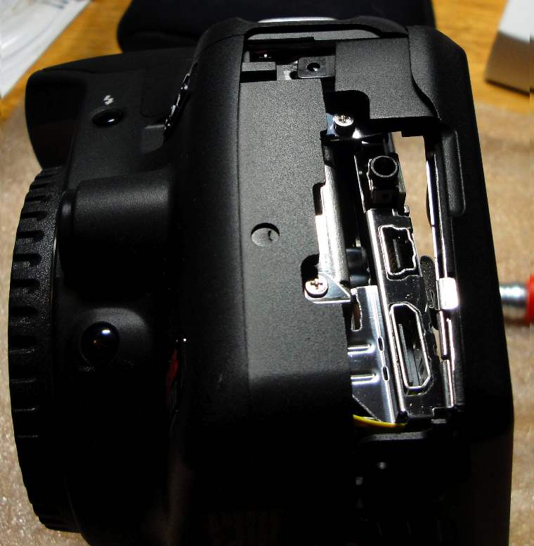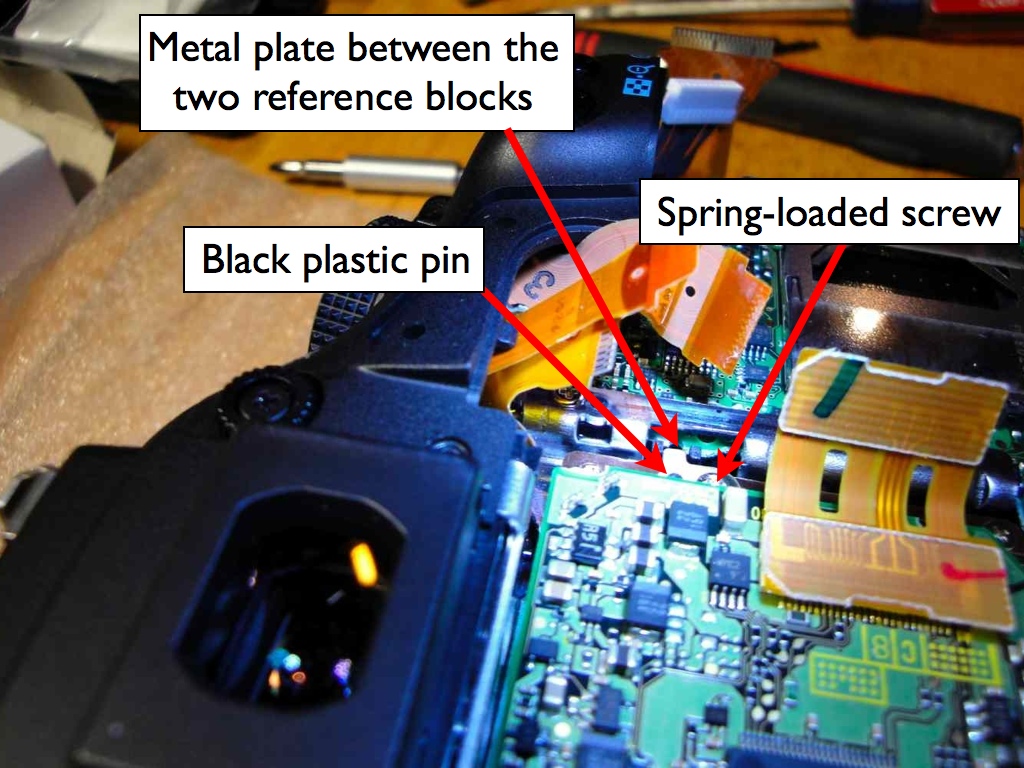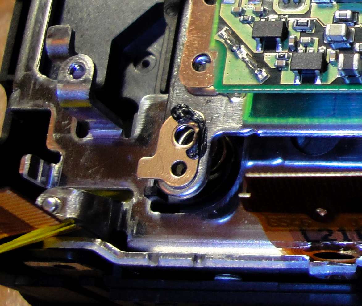 Out of the 3 positioning screws, the top one is the hardest one to access. I had to drill a small hole in the camera case to access it. It is also probably possible to access it through a more complete disassembly of the camera. This view shows the hole I drilled and the positioning screw assembly just below it.